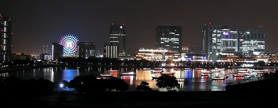 Odaiba (お台場) is a large artificial island in Tokyo Bay, Japan, across the Rainbow Bridge from central Tokyo. Odaiba was initially built for defensive purposes in the 1850s. The land was dramatically expanded during the late 20th century as a seaport district, and was redeveloped in the 1990s into a major commercial, residential and leisure area. Odaiba, along with Minato Mirai 21 in Yokohama, is one of the few manmade seashores in Tokyo Bay where the waterfront is accessible and not blocked by industry and harbor areas.