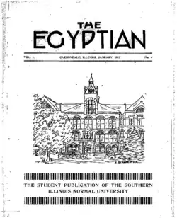 The Daily Egyptian, formally known as the Normal Gazette and later changed to The Egyptian in 1916, was the first newspaper at Southern Illinois University. It consisted of eight pages and was printed monthly by the Free Press Printing House of Carbondale, Illinois in 1888 to 1889.[1] The subscription cost was fifty cents per year. In June 1889, over a thousand copies of the Normal Gazette were printed. J. T Calbraith, editor, considered publishing the third edition of the paper in a magazine format in 1890 but for reasons unknown the magazine was never published.[2]