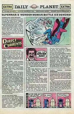But where the 'Bullpen Bulletins' talked about what the [Marvel Comics] staff was doing, and teased new projects in the works and such, the Daily Planet was a mock newspaper front page that ran in all the books, that had two or three 'articles' about books that'd be out on the stands the following week, plus a full checklist of what would be out next week, a list of what was on the stands this week, a cartoon by Fred Hembeck or a Q&A column with Bob 'The Answer Man' Rozakis, that sort of thing. And every week, I'd read those articles and that checklist, and I'd think, 'Huh, Batman meets Scalphunter in the next Brave & Bold. Do I want to buy that?' And, well, no, I didn't, not in that case — but at least I was more aware of what was coming out, and I thought about buying books I'd never even have looked at otherwise. That page probably sold me a lot of DC Comics over the years, and it made me aware of DC as a line, everything from Superman to Weird War Tales, from Justice League to Jonah Hex.[2]