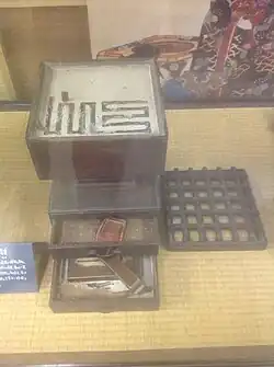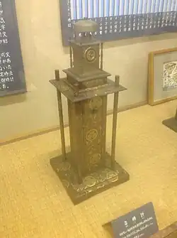 Daimyōs ('great lords') were the feudal aristocracy of Japan in the Edo period and they were the only people who could afford expensive timepieces.[4] The museum displays mechanical clocks, sundials and incense clocks previously owned by daimyo families. There are around 50 pieces on display from the collection's total of some 200 items, in a single 83 square metre room.[3] The museum's labels are all in Japanese only, though an English-language pamphlet explaining the traditional Japanese timekeeping system is also available.[5]