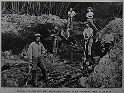 In the 1850s, Maurice and Mary Kelly established a dairy farm in the area, likely at the location of the North Shore Aerodrome. They named the adjacent stream Dairy Stream, and Dairy Flat was in turn named after the stream.[8] The first known references to the name Dairy Flat come from 1865.[9] The area was a plentiful source of kauri gum, which was sold at the local kauri gum camps: Bull Town on Poyntons Farm, Tiger Camp, and Horse Shoe Bush/Nanahu.[10] Maurice Kelly took over the family timber felling business in the 1860s and 1870s.[8] In 1878, Dairy Flat School was established.[11]