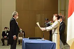 Kimura received the certificate of the Person of Cultural Merit from Hinako Yokota (November 4, 2020)