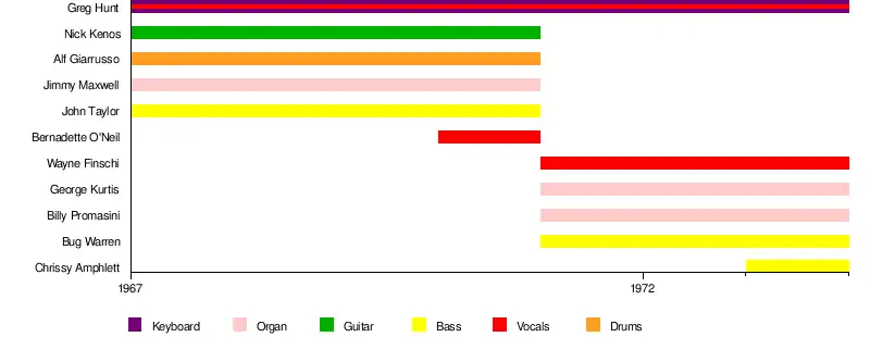 By 1971 the band broke up, however, Greg Hunt continued the band for a few years later with new members. Their new line up was Wayne Finschi on the drums, George Kurtis on the organ, Billy Tomasini on lead guitar, Doug Warren on bass.[1] Chrissy Amphlett joined the band in 1973 when she was 14 years of age.[3] In her autobiography 'Pleasure and Pain: My Life' she briefly describes her experiences with the band, with their new members.[12]