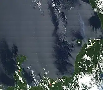 The Dakataua Caldera is located at the northern tip of the Willaumez Peninsula, New Britain, Papua New Guinea. The peninsula includes the 350 m high andesitic Mount Makalia stratovolcano.[1] The last major collapse of Dakataua was during the Holocene around 800 CE.[2] The most recent eruption on the caldera's rim was Mount Makalia in 1890, producing lava flows and cinder cones.[3]