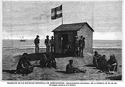 The Spaniards established whaling stations with some cod fishing and trading. In 1881, a dock was anchored off the coast of the Río de Oro Peninsula to support the work of the Canarian fishing fleet. However, it was not until 1884 that Spain formally founded the watering place as Villa Cisneros, in the settlement dated in 1502 by Papal bull. It was included in the enclaves conceded to the Spanish to the east of the Azores islands. Upon arriving in Rio de Oro in 1884 to establish their first coastal factories, the Spanish were forced to deal with the Oulad Delim, a Sahrawi Arab tribe that controlled the entirety of Rio de Oro and a strip of land in Mauritania extending from Nouadhibou to Idjlil.[7] In 1884, the settlement of Villa Cisneros was promoted by the Spanish Society of Africanists and funded by the government of Canovas del Castillo.[8] In the same year, the Oulad Delim attacked the trading post and looted its stores before the Spanish issued a royal decree that placed the coast from Cape Bojador to Cape Blanc under Spanish colonization. By 1886, Spanish colonial authority was extended 150 miles inland. The Spanish reached an agreement with a sheikh of the local Oulad Delim two years later.[9]