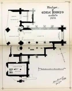 William FitzRalph left his daughter and her husband to work out the details of the new foundation, pleading the urgency of the king's business overseas. The couple went to meet Abbot Lambert of Newsham or Newhouse Abbey and secured from the chapter a delegation of nine canons to establish a colony at Deepdale.[50] Some of the founding canons are named by the chronicler: Walter de Senteney, John de Ryford,[51] Hugh de Grimsby, Roger de Alesby, William le Sores. The Victoria County History account of Dale Abbey, edited by William Page, but written by John Charles Cox, dates this to 1195, which seems too early, while the earlier account of Newsham, also edited by Page, has Lambert occurring 1200–3,[52] a much more plausible time frame. Colvin reckoned that the leader of the canons, Walter de Senteney, became abbot of Dale in January 1200.[53] The date accepted for the foundation of Abbey is 15 August, the Feast of the Assumption, 1204, as reported by Bishop Richard Redman, Vicar-General of the Abbot of Prémontré, during his canonical visitation in 1478.[54] This probably marks the founding or consecration of the new abbey church, rather than the inception of the convent itself.[43] However, there are considerable problems with the chronology and order of events – partly because the relevant royal confirmation charters and papal bulls are missing from the cartulary – that make an entirely satisfactory account of the foundation of Dale Abbey impossible.[55] Whenever the new community was founded, it would have been a priory initially, as the complement required for an abbey would be 12 canons and their abbot, based on the precedent of Christ and the Twelve Apostles. The 1204 date perhaps simply reflected the achievement of a steady quorum: the precise date reflects the Premonstratensian preoccupation with the Assumption of Mary, a doctrine that was not confirmed as a dogma until Pope Pius XII's definition in 1950.
