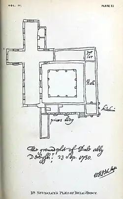 | Visible remains | Arch of church east window, wall footings. |