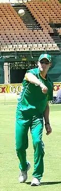 Dale Willem Steyn (/ˈsteɪn/; born 27 June 1983) is a South African former professional cricketer who played for the South African cricket team. He is regarded by many as the greatest bowler of his era.[1][2][3] Steyn's ability to produce late swing at high pace - a rare and lethal combination amongst fast bowlers - made him stand apart from many of his contemporaries. Many cricketing legends have regarded his length deliveries unplayable when the ball swung. During the 2007–08 season, Steyn achieved a tally of 78 wickets at an average of 16.24,[4] and was subsequently rewarded with the ICC 2008 Test Cricketer of the Year Award.[5] He was named one of the Wisden Cricketers of the Year in 2013,[6] and the Wisden Leading Cricketer in the World for the year 2013 in 2014's Wisden Cricketers' Almanack.[7][8][9] In December 2015 he injured his shoulder in the Durban Test against England ; after this injury his career was a short lived one as it was followed by multiple injuries;[10] these injuries were the reason why many cricketing greats didn't even consider post 2015 Steyn as "The Dale Steyn" which the batsmen feared to face. He was featured in Wisden Cricketers of the Decade at the end of 2019. He also was included in the ICC Test Team of the Decade at the end of 2020.[11]