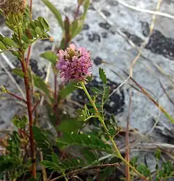 This is a perennial herb growing 20 to 80 centimeters tall, with a number of erect stems sprouting from a hard root crown. The leaves are each made up of hairless oval leaflets measuring up to 1.3 centimeters long. The inflorescence is a cone-shaped or cylindrical spike of many purple flowers with pointed green bracts between them. Blooming occurs in summer.[1][3] The flowers are pollinated by bumblebees.[4] The seeds can persist in a soil seed bank for 8 years.[4]