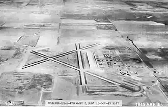 It was initially designated as "East Field" and had three 8,000-foot paved runways, with a large paved ramp and hangar on the east side. Dallam also had a substantial number of support buildings on a street grid to the east of the ramp. Its history is similar to Hartley Field, being an auxiliary glider airfield in 1942, and used by the 415th Bombardment Group 521st Fighter-Bomber Squadron. The 521st performed initially A-24 Banshee dive bomber training, then switched to P-39 Airacobra fighter pilot replacement training later in 1943. With Second Air Force taking over the field in December 1944, the 507th Fighter Group used the field for P-47N Thunderbolt escort pilot training for a few months until training ended at the end of April, 1945.[2][6]