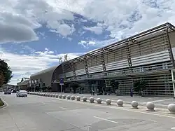 The airport has a single terminal building, with additional buildings located near the terminal building. The west side of the airport features a message on a hill welcoming visitors, which is visible from the air.