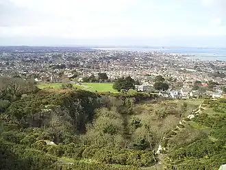 After the construction of the harbour, quarrying only continued sporadically thereafter before finally ending in 1917.[9][10] In 1914, the quarry was taken over by what is now known as Dún Laoghaire–Rathdown County Council (DLRCC), and most of the land was added to the existing Killiney Hill Park thus opening it up to the general public.[1] In 1998, the DLRCC drew up proposals to turn the quarry's West Valley into a caravan halting site for travellers. The move met with opposition from local residents, climbers, and environmentalists, and the plans were eventually dropped.[11] In May 2010, DLRCC angered climbers when they removed several large boulders from the quarry, disrupting climbing routes and potentially damaging other climbing routes in the process.[12]