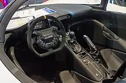 The interior of the car has carbon fibre as its main element and has all of the main controls of the car integrated into the steering wheel. Vital information of the car such as speed and rpm are displayed on a motorsports-style display screen on the steering column. The seats are carbon-fibre shells fixed to the chassis and have foam padding applied on them. The steering column and paddles are adjustable in order to alter the driving position. Minimal luggage can be stowed in two compartments located behind the engine and two additional compartments in the seats are designed to store two race helmets. The total space of these compartments is four cubic feet.