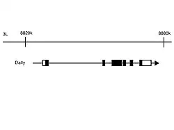 Dally's gene was located in the chromosome 3, concretely in the region 3L 8820605-8884292.[4]