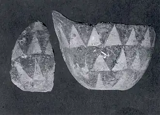 - Dalma Painted: Dalma painted wares have very different decoration patterns on the surface with bold geometric and triangular patterns.[4][7] They are painted in red with purple and brown shades on light and yellow background.[7] Parts of the excavated vessels in this category have double-coloured paintings on them, and the majority are monochrome.[1]