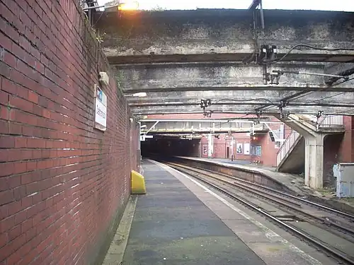Dalmarnock station (pre-2014 refurbishment), looking towards the tunnel | |||||