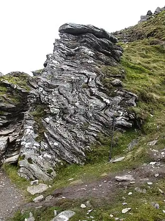 Folded Dalradian phyllites of the Ediacaran to lower Cambrian Ben Ledi Grit Formation, part of the Southern Highland Group | |