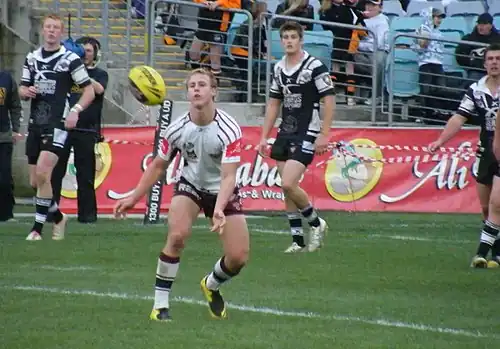 He began playing rugby league for the Redcliffe Dolphins at 5-years-old. At 12 years of age Cherry-Evans moved to Mackay, Queensland with his family and continued to play junior rugby league for Mackay Brothers, Sarina Crocodiles and South's Sharks.[5] He attended St Patrick's College during his high school years. He also attended Redcliffe State High School in Year 12 and played for the school's rugby league team.[6] At the beginning of 2008 Cherry-Evans was invited by Dennis Moore to trial with the Manly-Warringah Sea Eagles and later signed a contract to play for their under-20s National Youth Competition team.[7]