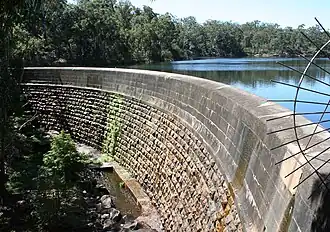 Hunts Creek near the city of Parramatta, Australia, was dammed in the 1850s, to cater to the demand for water from the growing population of the city. The masonry arch dam wall was designed by Lieutenant Percy Simpson who was influenced by the advances in dam engineering techniques made by the Royal Engineers in India. The dam cost £17,000 and was completed in 1856 as the first engineered dam built in Australia, and the second arch dam in the world built to mathematical specifications.[31]
