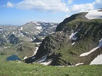 Damga (Bulgarian: Дамга) is a summit in the northwestern part of the Rila Mountain in southwestern Bulgaria reaching height of 2,669 m.[1] Damga is the main orographic node of northwestern Rila, connecting the ridges of Malyovitsa and Otovitsa. The peak is an impressive massif with mostly dome-shaped outlines. It dominates the western parts of the Urdina cirque containing the Urdini Lakes, where its slopes are steep and rocky. To the west, the slopes of the summit gently descend to the grassy folds of the Malko and Golyamo Pazardere meadows. It is built up of metamorphic rock.[2]