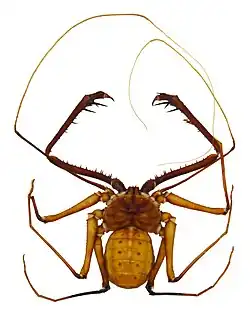 Damon medius can reach a body length of 3–4 centimetres (1.2–1.6 in). This strictly arboreal and nocturnal whip spider has a flat body and fragile legs, by which it moves sideways like a crab. In males the front legs are very long and antenniform, much longer than in the females. It has two large, spiny pedipalps, which are larger in the male than the female. It feeds on small insects.