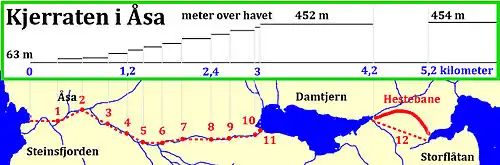 There is a road up to Damtjern from Stubbdal, a village situated at the head of Åsa in Ringerike. Damtjern is a setting-off point for walking in the area, both during summer and winter. Between Stubbdal and Damtjern there are old tracks to the Conveyor in Asa (Kjerraten i Åsa). At the Conveyor Museum (Kjerratmuseet) it is possible to learn how the Swedish engineer Samuel Bagge (1774–1814) made it possible for Peder Anker of Bogstad to move timber to Damtjern from Steinsfjorden, before floating it down to the Sørkedalselva river in Sørkedalen.[2][3][4]