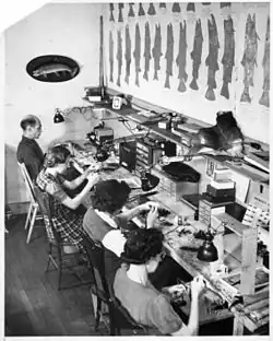 The original fly shop was established in the old Albermarle Hotel at 103 W Park Street along with a small shooting gallery. The Baileys lived in a back room and the rent was $25 a month.[2] Because there was limited opportunity for local fly business, Dan Bailey's became primarily a mail order fly shop and outfitter for visiting anglers. Dan Bailey produced his first mail order catalog in 1941—standard dry flies were $2.50 per dozen.[1] In 1981, the year before Dan's passing, Dan Bailey's Fly Shop was the largest manufacturer of artificial flies in the United States producing over 750,000 flies annually for wholesale and retail customers. The mail order business had over 50,000 subscribers.[1]