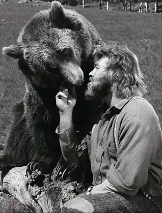 His experience with animals also brought him work as an animal trainer and handler in films produced by Walt Disney Studios. Haggerty directed white tigers, wolverines, eagles, and wild boar in the 1974 feature film When the North Wind Blows for Sunn Classic Pictures, which also produced The Life and Times of Grizzly Adams, a wildly popular film released the same year, in which he portrayed the title character Grizzly Adams.[5] From the latter film evolved the NBC television series of the same name which ran from 1977 to 1978, and Haggerty became known to movie-goers for his portrayal of nature-loving James Capen "Grizzly" Adams.