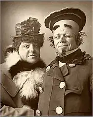 A journalist wrote, in the late 1890s, that Leno was "probably the highest paid funny man in the world".[72] In 1898, Leno, Herbert Campbell and Danvers formed a consortium to build the Granville Theatre in Fulham, which was demolished in 1971.[73] Leno published an autobiography, Dan Leno: Hys Booke, in 1899, possibly assisted by a ghostwriter, T. C. Elder.[10] Leno's biographer J. Hickory Wood commented: "I can honestly say that I never saw him absolutely at rest. He was always doing something, and had something else to do afterwards; or he had just been somewhere, was going somewhere else, and had several other appointments to follow."[74] That year, Leno performed the role of "waxi omo" (a slang expression for a black-face performer)[75] in the Doo-da-Day Minstrels, an act that included Danvers, Campbell, Bransby Williams, Joe Elvin and Eugene Stratton. The troupe's only performance was at the London Pavilion on 29 May 1899 as part of a benefit. Leno's song "The Funny Little Nigger" greatly amused the audience. His biographer Barry Anthony considered the performance to be "more or less, the last gasp of black-face minstrelsy in Britain".[75]