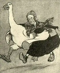 Leno considered the dame roles in two of his last pantomimes, Bluebeard (1901) and Mother Goose (1902), written by J. Hickory Wood, to be his favourites. He was paid £200 (£27,426 in 2023 adjusted for inflation)[26] for each of the pantomime seasons.[58][59] Leno appeared at Drury Lane as Sister Anne in Bluebeard, a character described by Wood as "a sprightly, somewhat below middle aged person who was of a coming on disposition and who had not yet abandoned hope"[60] The Times drama critic noted: "It is a quite peculiar and original Sister Anne, who dances breakdowns and sings strange ballads to a still stranger harp and plays ping-pong with a frying-pan and potatoes and burlesques Sherlock Holmes and wears the oddest of garments and dresses her hair like Miss Morleena Kenwigs, and speaks in a piping voice – in short it is none other than Dan Leno whom we all know".[61] Mother Goose provided Leno with one of the most challenging roles of his career, in which he was required to portray the same woman in several different guises. Wood's idea, that neither fortune nor beauty would bring happiness, was illustrated by a series of magical character transformations.[62] The poor, unkempt and generally ugly Mother Goose eventually became a rich and beautiful but tasteless parvenu, searching for a suitor. The production was one of Drury Lane's most successful pantomimes, running until 28 March 1903.[62]