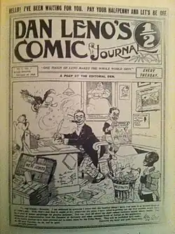 The same year, the comedian lent his name and writing talents to Dan Leno's Comic Journal. The paper was primarily aimed at young adults and featured a mythologised version of Leno – the first comic paper to take its name from, and base a central character on, a living person. Published by C. Arthur Pearson, Issue No. 1 appeared on 26 February 1898, and the paper sold 350,000 copies a year.[63] Leno wrote most of the paper's comic stories and jokes, and Tom Browne contributed many of the illustrations.[69] The comedian retained editorial control of the paper, deciding which items to omit.[70] The Journal was known for its slogans, including "One Touch of Leno Makes the Whole World Grin" and "Won't wash clothes but will mangle melancholy". The cover always showed a caricature of Leno and his editorial staff at work and play. Inside, the features included "Daniel's Diary", "Moans from the Martyr", two yarns, a couple of dozen cartoons and "Leno's Latest – Fresh Jokes and Wheezes Made on the Premises".[71] After a run of nearly two years the novelty wore off, and Leno lost interest. The paper shut down on 2 December 1899.[69][70]