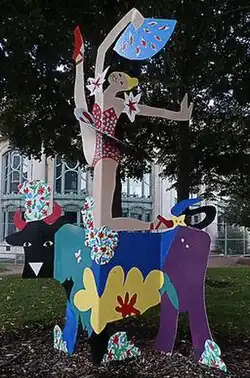 The steel sculpture depicts a ballerina "poised prettily" on a cow.[1] The cow is painted green, purple, blue and yellow, with a black face, white triangular nose and red horns. The ballerina bends one knee to rest on the back of the cow and kicks her other leg overhead. She wears a red and white polka-dotted leotard, white tutu and red ballet slippers. Both arms extend aloft, and she holds a blue fan above her head in one hand. The entire composition incorporates folds and assemblage to create a sense of angularity and dynamism.