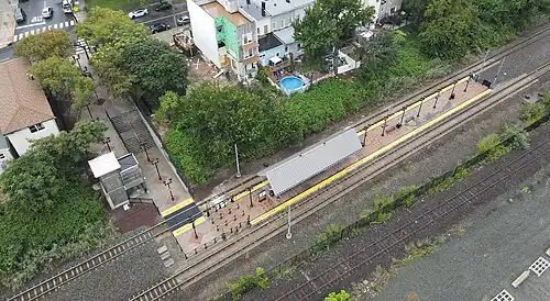 Danforth Avenue station is located north of the site of the former Central Railroad of New Jersey Greenville station. The former Greenville stop was located along the right of way at Linden Avenue, south of the current bridge over the railroad. The station opened on August 1, 1864 as part of a dummy railroad between the future Communipaw Terminal and Bergen Point until the CRRNJ Newark Bay Bridge was built across Newark Bay.[3] A station built in 1866 at that location burned down on May 11, 1869, and replaced with a two-story wooden depot that was 21 by 51 feet (6.4 m × 15.5 m) large.[4] The later station depot lasted until 1964, when it was razed in favor of a shelter.[4] Passenger service to Greenville ended on April 30, 1967, when the Aldene Plan went into effect, moving CNJ commuter services through Newark Penn Station via the Lehigh Valley Railroad. Service through Bayonne was truncated from Communipaw Terminal to CNJ's East 33rd Street station.[5][6]