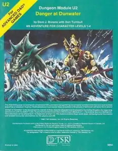 Danger at Dunwater is an adventure module for the Advanced Dungeons & Dragons (AD&D) fantasy roleplaying game, written by Dave J. Browne with Don Turnbull The module was first published by TSR, Inc. in 1982 and contains a 32-page adventure set in the World of Greyhawk campaign setting. It was designed for 6-10 characters of level 1-4.[1]