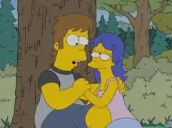 Back in 1988, Ned comforts Homer, who is despondent at Marge's absence the previous night, and encourages him to consider marrying Marge in the future. Taking a walk through the woods with Marge, Homer carves the message "Marge + Homer 4ever" into a tree. In the present, Homer sees this message, and tries to cut it out of the tree to show to Marge as a symbol of their everlasting love. Marge arrives to reassure him but accidentally knocks the tree over a ravine. Homer clings onto the bark and falls down the ravine toward the river below with Marge falling after. They are saved by Bart and Lisa in their pedal car, which Bart had accidentally driven into the river.