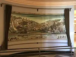 Mechau arrived for the installation with documentation about scalping techniques and, according to art historian Marling, "Indian preferences in the matter of costuming appropriate for victims".[4] The painting was installed in September 1937, after which Bureau of Indian Affairs commissioner John Collier ridiculed Rowan's and Mechau's earlier statements defending the depictions, calling the painting "a slaughter against pioneer women".[1][4] Washington's Evening Star, without mentioning the nude women, immediately called the mural "Art at its Worst", said it had "shocked all who have seen it", accused "government doles" of "foster[ing]...radicalism in art", and accompanied its review with a recounting of Phoebe Atwood Taylor's Octagon House, a story of a town so scandalized by an offensive post office mural that members of the community broke in after hours and painted over it.[4]