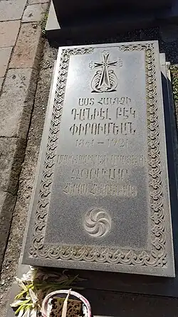 Several sources claim that Daniel-Bek Pirumyan was arrested and executed along with other officers in 1921 following the Sovietization of Armenia, either near Dilijan or in Ryazan, and that his cousin Poghos-Bek Pirumyan committed suicide after finding out about this.[3] In reality, Pirumyan, whose health had deteriorated in Turkish captivity, died suddenly in Yerevan in the autumn of 1922, as he was preparing to leave Armenia and join his wife in Moscow.[3] Pirumyan's remains are buried in the courtyard of Saint Gayane Church in Etchmiadzin in Armenia.[3]