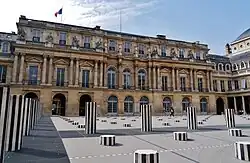 From 1960 on, Buren designed a number of permanent site-specific installations in the United States, Belgium, France, and Germany. In 1986 he created a 3,000-square-meter sculpture in the great courtyard of the Palais Royal, in Paris: Les Deux Plateaux, more commonly referred to as the Colonnes de Buren ("Buren's Columns"). This provoked an intense debate over the integration of contemporary art and historic buildings. In 1993, Buren was commissioned to design the work in situ, Poser/Déposer/Exposer, for the Café Richelieu at the Louvre in collaboration with Jean-Pierre Raynaud.