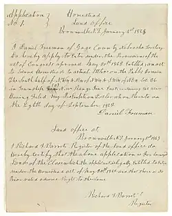 Although the land was cheap or free, many homesteaders did not last five years because of the blizzards, drought, disease, plagues of locusts, and loneliness on the open prairies.[2] January 1, 1863, was the day the Homestead Act went into effect. Freeman may have been a scouter for the Union Army, and he said that he was leaving for St. Louis that morning for military duty. Freeman persuaded a clerk to open the land office just after midnight so he could file his claim.