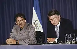 When Somoza was overthrown by the FSLN in July 1979, Ortega became a member of the five-person Junta of National Reconstruction, which included Sandinista militant Moisés Hassan, novelist Sergio Ramírez, businessman Alfonso Robelo, and Violeta Barrios de Chamorro, the widow of a murdered journalist. In September 1979, United States President Carter hosted Ortega at the White House, and warned him against arming other Central American leftist guerrilla movements.[43] At the time, Ortega spoke truthfully when he denied Sandinista involvement in neighboring countries.[43] When Ortega questioned the Americans about CIA support for anti-Sandinista groups, Carter and Deputy Secretary of State Warren Christopher said the reports were false.[43] After the meeting, Carter asked Congress for $75 million in aid to Nicaragua, contingent on the Sandinista government's promise not to aid other guerrillas.[44]