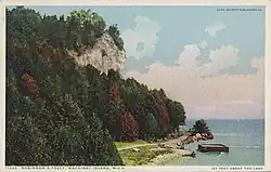 According to local legend, Captain Daniel Robertson built a small summer house on an overhanging cliff at the southeast corner of Mackinac Island, now called Mission Point. Robertson was said to have entertained his fellow officers at his summer house, where they enjoyed smoking pipes and cigars, and drinking wine.[9] However, after a few years, part of the cliff including the summer house collapsed to the base of the rocks, leaving a mass of debris on the beach.[9] For over a century, the cliff was called "Robertson's Folly"[10] but eventually became known as "Robinson's Folly," a corruption of Robertson's name.[1][5]