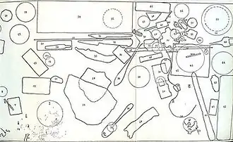 In connection with a one-man show of his snare-pictures at the Galerie Lawrence in Paris in 1962, Spoerri wrote his Topographie Anécdotée* du Hasard (Anecdoted Topography of Chance). Spoerri was then living at the Hotel Carcassonne in Paris, in room number 13 on the fifth floor. To the right of the entrance door was a table which his wife Vera had painted blue. Spoerri drew on a ‘map" the overlapping outlines of all the 80 objects that were lying on the table on 17 October 1961 at exactly 3:47 p.m. Each object was assigned a number and Spoerri wrote a brief description of each object and the memories or associations it evoked. The descriptions cross referenced other objects on the table which were related. The Topographie Anécdotée* du Hasard was printed as a small pamphlet of 53 pages plus a fold out map and index and was distributed as an advertisement for the exhibit.[13] The Topographie Anécdotée* du Hasard is more than just a catalog of random objects, however; read in its entirety, it provides a coherent and compelling picture of Spoerri's travels, friends, and artistic endeavors.