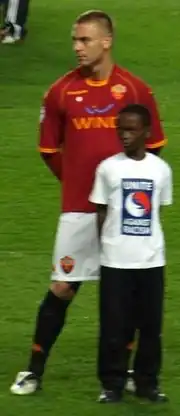 He soon established himself as a permanent member of the starting line-up in the holding midfield position during the next few seasons, and was considered one of the most promising young Italian players in the league, helping Roma to a second-place finish in Serie A during the 2003–04 season,[6][10] and consecutive Coppa Italia finals in 2005[11] and 2006.[12] Due to his maturity, tenacity and leadership on the pitch, on 15 March 2006, De Rossi wore the captain's armband for the first time in an UEFA Cup match against Middlesbrough.[6] Despite earning several cautions and a reputation as a hard-tackling player during the 2005–06 season, on 19 March 2006, De Rossi was praised by referee Mauro Bergonzi for fair play.[13] Roma were trailing 1–0 in a Serie A match against Messina, when De Rossi scored a goal from a header, which had been deflected off of his hand; Bergonzi did not see the incident and allowed the equaliser to stand. However, De Rossi immediately told the referee that he had pushed the ball in with his hand, leading to the goal being disallowed. Roma went on to win 2–1, although De Rossi endured an injury to his ankle during the match, which ruled him out for two weeks.[14] At the end of the season, he was named the 2006 Serie A Young Footballer of the Year for his performances.[15]