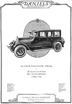 Daniels Motor Company was a pioneer brass era American automobile company, founded in 1915 by George E. Daniels (formerly of General Motors) with Neff E. Parish.[1] George Daniels was a known lawyer, engineer, and mechanic. He was considered the best motorcar designer in the United States.[2] Neff Parish had his own automobile parts and framing manufacturing company. Neff was the creator of the time's highest-grade heat-treated alloy steel frames, respected in the steel industry.[3] Daniels Motor Company produced 1,500 high-quality automobiles between 1916 and 1924, branding themselves as “the distinguished car with just a little more power than you will ever need”, and “The aristocrat of American cars”.[4]