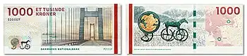 The 1000-krone banknote was issued on 24 May 2011. It features the Great Belt Bridge and the Trundholm Sun Chariot from the early Bronze Age, approximately 1400 BC.[1] The 1000-krone banknote will, as of 31 May 2025, no longer be legal tender.[6]