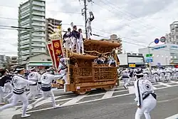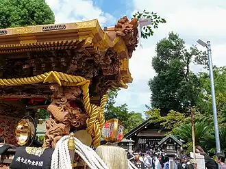 Danjiri are large wooden carts (danjiri guruma) in the shape of a shrine or temple. The carts, often being crafted out of wood, are very ornate, with elaborate carvings. Towns with danjiri festivals in them have different neighborhoods, each with their own guild responsible for maintaining their own danjiri cart. The cart is kept in storage for most of the year. As the festival approaches, the danjiri cart is prepared with elaborate flower arrangements, prayer cards, ornaments, and religious consecrations. They also make a special song every year. It is believed that spirits or gods reside in the danjiri. The person on the roof of the Danjiri cart controls the direction of movement and performs a traditional fan dance.[3]