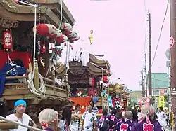 Danjiri Matsuri are cart-pulling festivals held in Japan. The Kishiwada Danjiri Matsuri is probably the most famous. There are other Danjiri Matsuri held in the City of Kobe[1] and Haruki Town, but they are less popular and spectacular. The highlight of the Festival is a race between floats representing different neighborhoods.[2]
