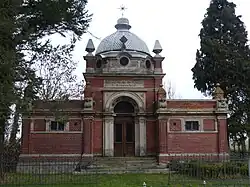 The small cemetery that accompanies the Mönchow church is the final resting place of the Dannenfeldt family. Carl Dannenfeldt commissioned a master mason from Swinemünde named Pistorius to build a mausoleum in the churchyard.[1] The mausoleum, which was completed in 1891, cost the Dannenfeldts 25,000 gold Marks.[2] The mausoleum houses three rooms with the walls made out of stucco. The outside walls are made out of red brick and the overall design is a Baroque style. There are cherubs that decorate the outside, with "Dannenfeldt" inscribed onto them.[3][4][5]