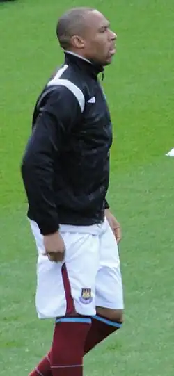 Gabbidon moved to West Ham in July 2005, as part of a deal that also took fellow defender James Collins to Upton Park.[23] His performances for his country during the year won him the Welsh Footballer of the Year award in October 2005.[24] He established himself in central defence alongside Anton Ferdinand and helped West Ham to a mid-table position in the Premier League in the 2005–06 season and to the FA Cup final in May 2006, receiving a runners-up medal.[25] After his performances in the 2005–06 season, he was voted 'Hammer of the Year' with Marlon Harewood named as runner-up.[26] Gabbidon had been ever-present as West Ham struggled against relegation in the 2006–07 season, when he suffered a torn hamstring in November 2006, which sidelined him for a month.[27] Groin injuries required surgery in January 2007 and again in April, ruling him out for the rest for the season.[28] West Ham started the 2007–08 season with Anton Ferdinand and Matthew Upson in the centre of defence with Gabbidon as substitute.[29]