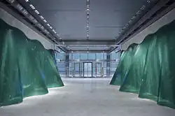 In 2003, Lane made Parting of the Waves for Canary Wharf Plc, East London. The work is a 4m high, 10m long ribbon of glass running each side of the north entrance. It was constructed from 2000 narrow strips of glass, which are locked into place by their own weight.[25][26][27][28]